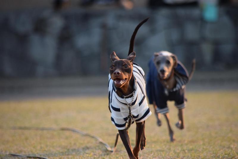 芝で解放されたミニピン達が自由気ままに